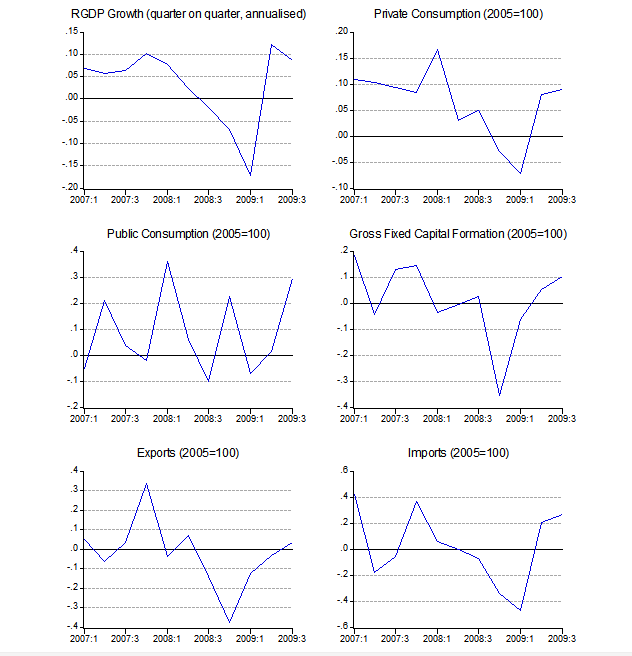 The risk here is we beget a “free rider” problem – if only one country is doing the spending, they bear the cost while gaining less of the benefit. Fiscal rectitude on the part of their trade partners under those circumstances would amount to being bad global citizens. Also pertinent is that the US stimulus spending could have the paradoxical effect of exacerbating global trade and capital imbalances that helped start this whole mess in the first place. Hence the calls for coordinated international action in stimulus spending earlier this year; and the talk about the need for coordination when withdrawing stimulus spending, which should presumably happen later next year. So under the circumstances, where we have had a synchronous global downturn, there are solid grounds for fiscal deficit spending.